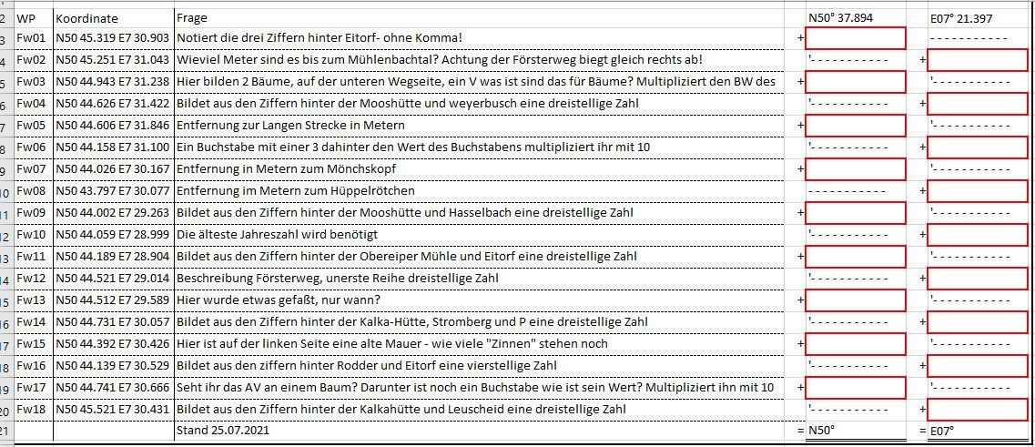 Um das Final zu finden müsst ihr die Fragen beantworten und alle "ungeraden" WP zu N50° 37.894 addieren. Genau so verfahrt ihr mit den Ergebnissen der "geraden" WP und addiert sie zu E07° 21.397 Siehe unten stehende Tabelle