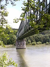 Bahnstrecke Wels–Passau. Aufgrund der beengten Platzverhältnisse zweigt die Strecke kurz hinter der Maximiliansbrücke (Eisenbahnbrücke über den