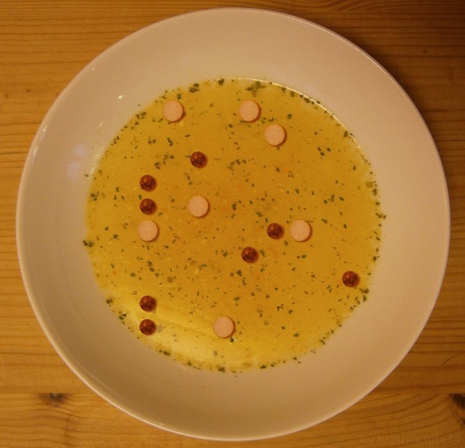 «Sausage soup (which means Worschtsupp in Hessian), I don't like» - or maybe...? You won't find anything at the above listed coordinates except for the cauldron with the sausage soup. Possibly it might be a little too large even for the most hungry guys. But to solve the puzzle someone has to finish it. Enjoy your souped-up meal. And remember, it's not duck soup.