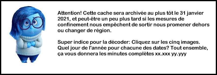mlafortu: Tel qu'annoncé en janvier, cette cache est maintenant archivée. Cette cache aura vécu 8 ans et 1 mois et aura reçu 66 founds. Merci de votre visite et de vos logs.