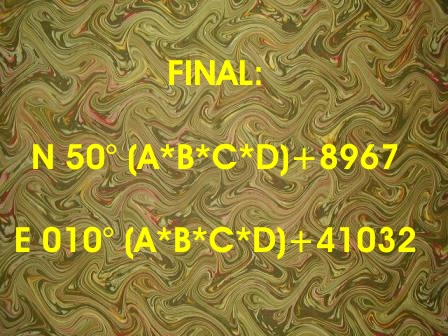 Und hier die Formel fürs Final für alle GPS Geräte (ohne Bilder): N 50° (A*B*C*D) + 8967 E 010° (A*B*C*D) + 41032