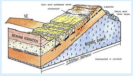Above this and of only slightly younger age is the Koogah formation consisting of alternating layers of sandstones containing fossilised shellfish (brachiopods and pelecypods), and conglomeratic mudstones. These alternating layers are called the Bickham Formation and this is the structure containing the seam of coal.