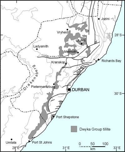Surveys have shown that the rocks overlying the Natal Group is a thick unit of Tillite. This was deposited in the glacial environment by retreating ice sheets during this period.Tillite is mostly a very fine-grained, blue-grey rock comprised of clay matrix with inclusions (or clasts) of many other fragments picked up by glaciers during their travels. The map below shows areas where Dwyka Group Tillite can most commonly be found in KwaZulu-Natal.