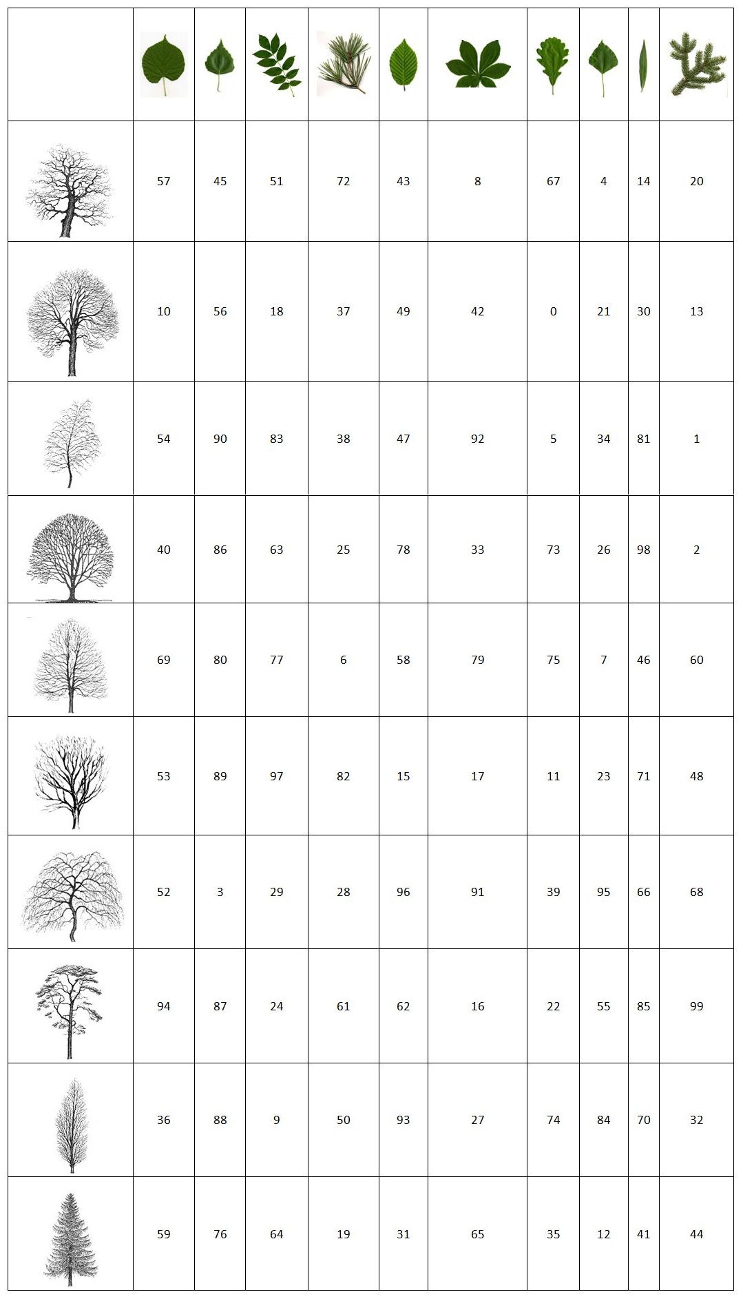 In der folgenden Tabelle sind 10 Silhouetten von Bäumen abgebildet und ebenso viele "Blätter". Ihr müsst ermitteln wer zu wem gehört und die Zahlen in den jeweiligen Schnittpunkten der Tabelle addieren. Das Ergebnis nennen wir "L".