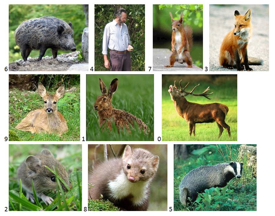 Ihr müsst den unten abgebildeten Spuren die Ziffern vor den zehn Lebewesen zuordnen.