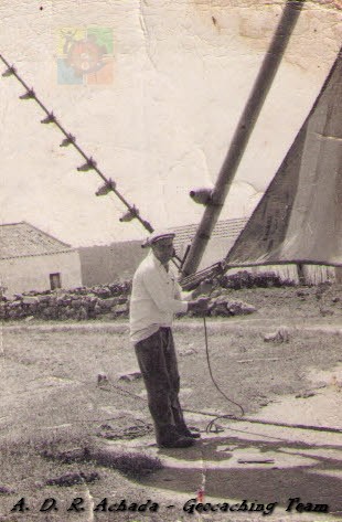 (Aqui podemos ver António "Moleiro", a "dar roupa ao moinho", tarefa essencial para a vela poder girar.)