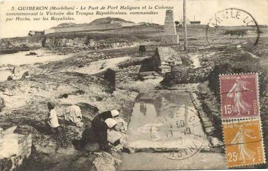 Today the church of Quiberon is still located at the same place (N 47° 29.016 W 003° 07.119). The ancient tower of Fort Penthièvre must have been located at N 47° 32.566 W 003° 08.243. There is no more flagpole nowadays.