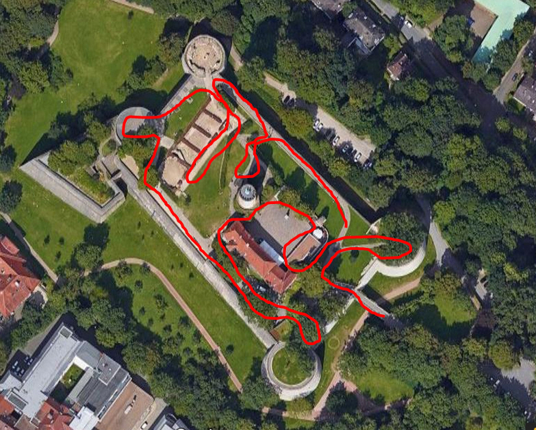 Auf der Luftansicht der Sparrenburg ist ein Weg vorgegeben. Den müsst ihr so ablaufen, wie er zu sehen ist. Eure Aufgabe ist es entlang des Weges die Bilder zu suchen.