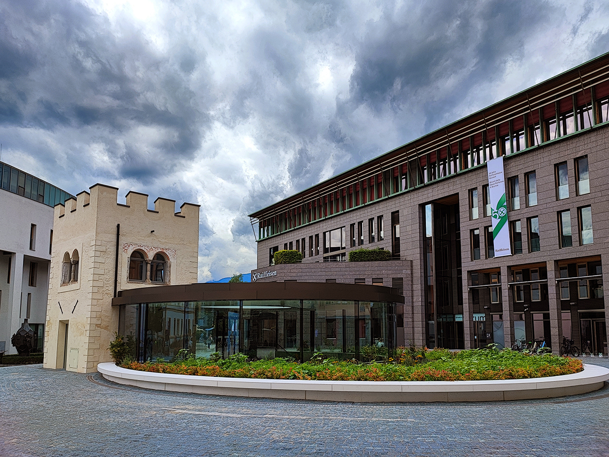 The entire sqare Raiffeisenplatz was redesigned in the years 2021 to 2023: on the north side of the bank Raiffeisenkasse Brunico, the existing danger zone at the parking in front of the Eurospar on the street Stegener Straße was eliminated. On the lower levels, in addition to an expanded commercial area on the first basement floor, new garages were built with the redevelopment of the existing garages. In addition, a passage was built towards the street Stegener Straße. The powder tower houses the "MMM TORRE" museum, which until the moment of the restructuring was called "MMM Biography". Interesting is the fact that the historic building was completely relocated during the reconstruction work (see video). The official opening of the new zone took place on August 2, 2023.