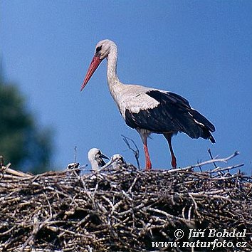 Jedná se o jednoho z největších u nás žijících ptáků. Jak naznačuje český název, v barvách jeho peří převažuje bílá. Jen letky a velké krovky jsou černé. Velký zobák a dlouhé nohy jsou červené.