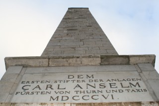 Hier befinden Sie sich in der Fürstenallee. Fürst Carl Anselm von Thurn und Taxis stiftete sie im 18.Jahrhundert. Die rings um Regensburgs Stadtmauern durchgehende Allee mit 1500 Bäumen sollte jedermann zugänglich sein. Damit wollte Carl Anselm den Menschen eine schöne Umgebung für Spaziergänge schaffen und sich selbst ein Denkmal setzen. Aus Dankbarkeit gegenüber dem Erbauer erhielt sie den Namen „Fürst-Anselm-Allee“ und so heißt sie auch heute noch. Diese Anlage wurde etwa 20 Jahre nach der Errichtung zu einem Park umgestaltet und weiterentwickelt. Dem edlen Stifter zu Ehren wurde dabei auch ein echtes Denkmal aus Stein gebaut - der Obelisk, vor dem Sie stehen.
