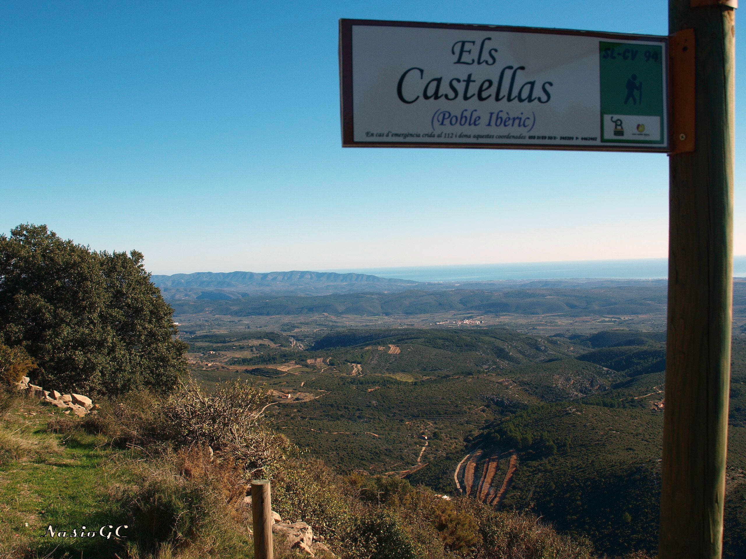 Desde el caché La Serra: La Mola (3) – El Cingle, continuamos por el SL; aunque el GPS os indique hacia el este, recomendamos seguir la ruta marcada, no es mucho más largo el camino y sí bastante más fácil. El cuarto de la serie se encuentra en el extremo E de la Mola, un excelente mirador hacia la Plana y el Maestrat en la cima del cual se halla Els Castellàs, un antiguo poblado íbero de entre los siglos VI y I a.C., actualmente cubierto de vegetación, pero en el que todavía puede apreciarse la estructura y el foso que lo resguardaba.