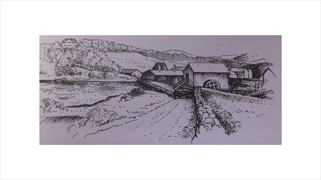 Bilden är en bearbetning av Charlotte Hovings målning från 1840-talet.På denna sidan av ån ser vi sågen och kvarnen. På bortre sidan ligger smedjan med sina två skorstenar.De mindre byggnaderna bakom smedjan bör vara kolhus, järnbodar och klensmedja. Uppe till vänster skymtar herrgården, som den såg innan 1863 då den monterades ner och flyttades till Oscarshöjd.
