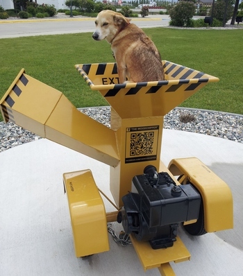 At a year old, Penne is in ND helping me investigate the woodchipper, from the movie "Fargo"
