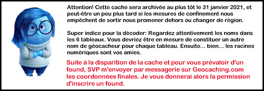 mlafortu: Tel qu'annoncé en janvier, cette cache est maintenant archivée. Cette cache aura vécu 8 ans et 2 mois et aura reçu 94 founds. Merci de votre visite et de vos logs.