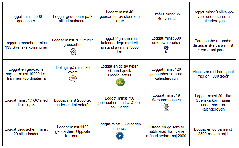 Detta är Mr_finders challenge. Den bygger på olika saker jag har uppnått genom åren av geocachande. Koordinaterna är de rätta, men för att logga denna måste du ha uppnått 5 saker i samma rad, kolumn eller diagonal. Om du lyckas att uppnå alla 25 saker. Nja, då är du nog Mr_Finder. Det finns ingen annan geocachare som uppnår alla 25 alternativ, när denna publiceras. Lycka till!