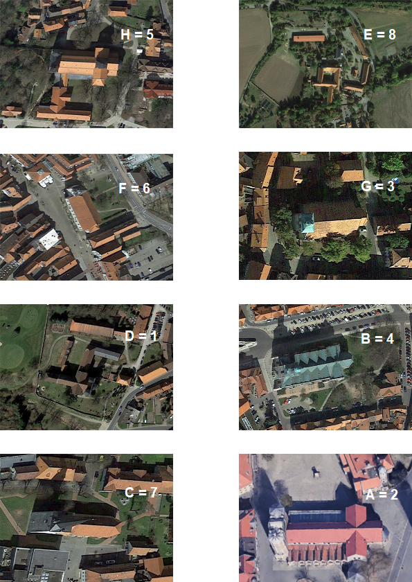 In der Ursprungsversion konnte per „spaceplotting.com“ die Suche nach dem Standort der Kirchen vorgenommen werden. Da es nun Probleme beim Aufruf dieses Programms gibt, wird eine Änderung bei der Zuordnung der Kirchen zu den Hinweisen vorgenommen. Auf den Bildern seht Ihr 8 Kirchen aus der Vogelperspektive, denen jeweils ein Buchstabe mit einer Zahl zugeordnet ist.