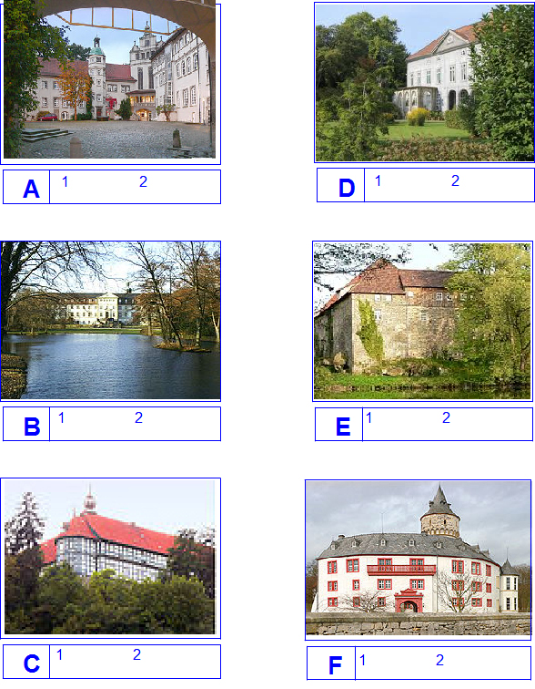 Auf den 6 Bildern sind Burgen und Schlösser abgebildet und mit Buchstaben gekennzeichnet. Ausserdem gibt es 2 Blöcke mit je einen Hinweis zu den einzelnen historischen Gebäuden. Sind die Zahlen hinter den Hinweisen den richtigen Buchstaben zugeordnet und je nach Vorzeichen addiert oder subtrahiert , können die Koordinaten errechnet werden.