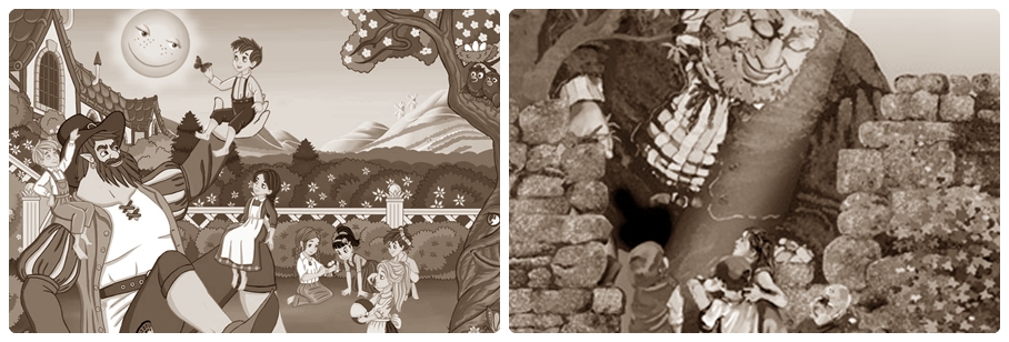 Late one day, suddenly, looking at the corner of his garden he saw a tree with golden branches, silver fruits and white blossoms. In one of its branches was the child that was so missed by the giant. Quickly and with great effort the giant went to meet him. As we approached the spot, the giant turned red with anger as he saw that the child had wounds in both hands and feet.