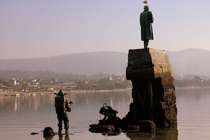 Lo que os queremos mostrar es una estatua con truco... si está la marea alta verás la estatua del Capitán Nemo del Nautilus, personaje de la mítica novela de Julio Verne “20.000 leguas de viaje submarino” según baja la marea verás a un buzo, de pie con la escafandra de aquella época, portando lo que parece ser un cofre y, con la marea totalmente baja podrás ver a un segundo submarinista que está en posición agachada