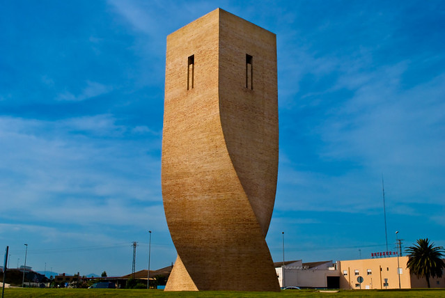 El Consistorio les encargó humanizar y dignificar la rotonda de un acceso principal, donde confluyen coches, naves industriales y el propio pueblo. E idearon con asesoramiento técnico una torre de ladrillos de 24 metros de alto, que sorprende por su dimensión y su forma, por el giro y la tensión que traza en su base y por la riqueza de las perspectivas que proporciona.