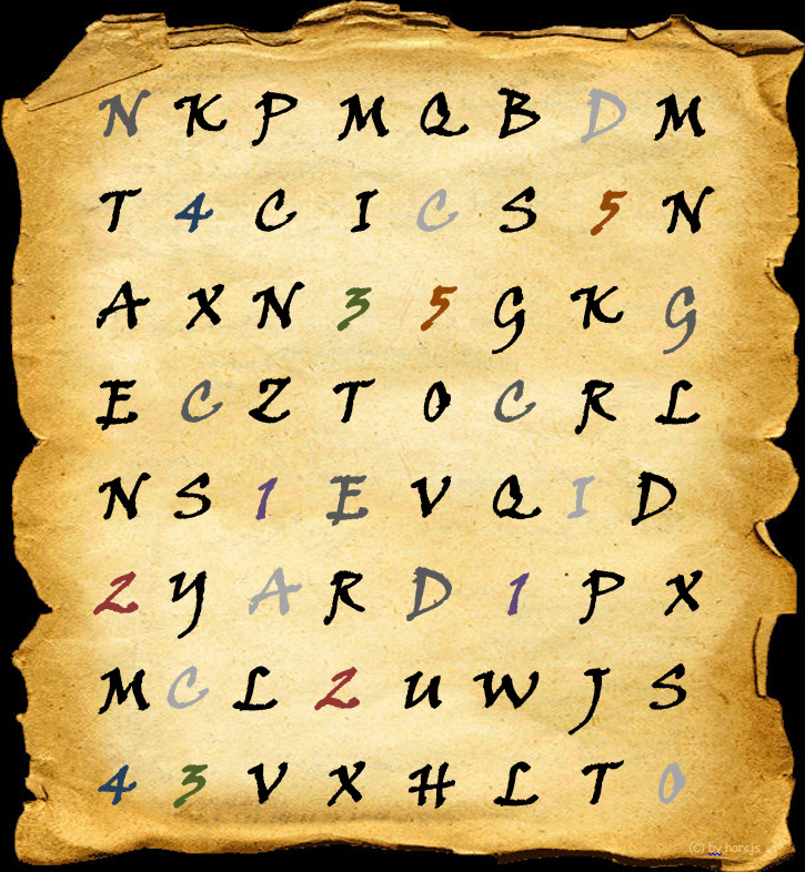 Vorsichtig legte ich die Ampulle frei und nahm sie mit zum Zelt. Dort zog ich den Korken heraus und fand darin ein noch recht gut erhaltenes Pergament. Darauf standen Buchstaben und Ziffern, die einerseits völlig durcheinander, aber scheinbar auch wie nach einem bestimmten Muster aufgeschrieben waren. Da ich aber keinen Sinn darin erkennen konnte, begnügte ich mich damit, das Pergament zu fotografieren und legte mich wieder schlafen.