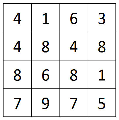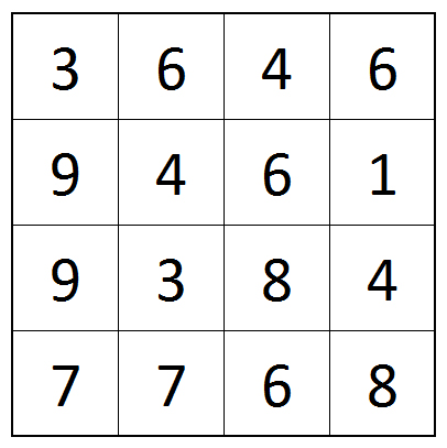 Diesmal ist es recht einfach, es gibt nur ein 4 x 4 Felder großes Rätselfeld. In ihm stehen Zahlen. Diese sind so zu ergänzen, dass die Summe in jeder Zeile und in jeder Spalte genau 100 ist. Die vorhandene Zahl kann dabei um eine beliebige Ziffer davor oder danach ergänzt werden oder es gibt gar keine Veränderungen an einer Zahl. Negative Zahlen sind nicht möglich