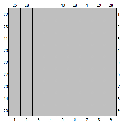Die Zahlen am oberen und linken Rand geben des Diagramms geben die Summe der Werte der schwarz gefärbten Felder in der betreffenden Zeile bzw. Spalte an.