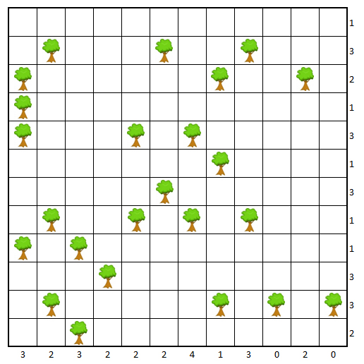 Die Diagramme stellen jeweils einen großen Wald dar. Die Zahlen am rechten und unteren Rand geben an, wie viele Dosen in der jeweiligen Zeile bzw. Spalte stehen. Jede Dose ist einem Baum horizontal oder vertikal benachbart; jeder Baum bekommt (mindestens) eine Dose; und keine Dose ist einer anderen Dose orthogonal oder diagonal benachbart. Bestimmt die Felder mit den Dosen!