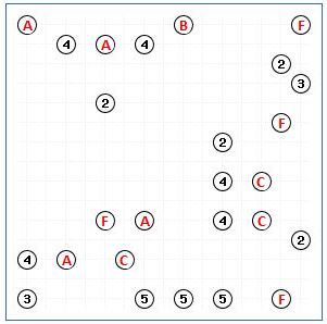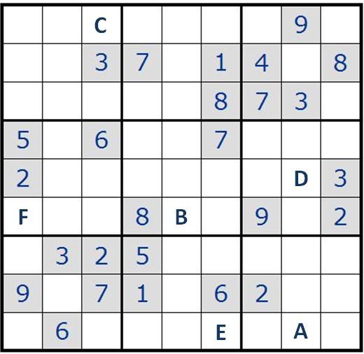 1) Resolva corretamente o Sudoku apresentado. As letras A a F deverão ser substituídas pelos algarismos respetivos.