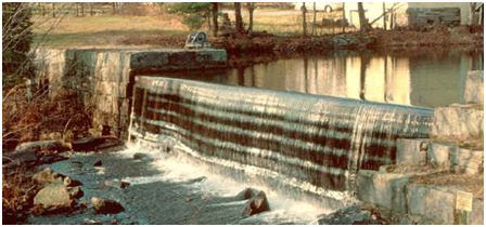 A weir dam is a small overflow-type dam that is used to raise the level of a river or stream. Weir dams have historically been used to create mill ponds but have also been used to control erosion. Water flows over the top of a weir. Since the weir is the portion where water is overflowing, a long weir allows a lot more water with a small increase in overflow depth. This is done in order to minimize fluctuation in the depth of the river upstream with changes in the flow rate of the river. Weir dams also give hydrologists and engineers a simple method of measuring the rate of flow over the weir and check oxygen levels of the water.