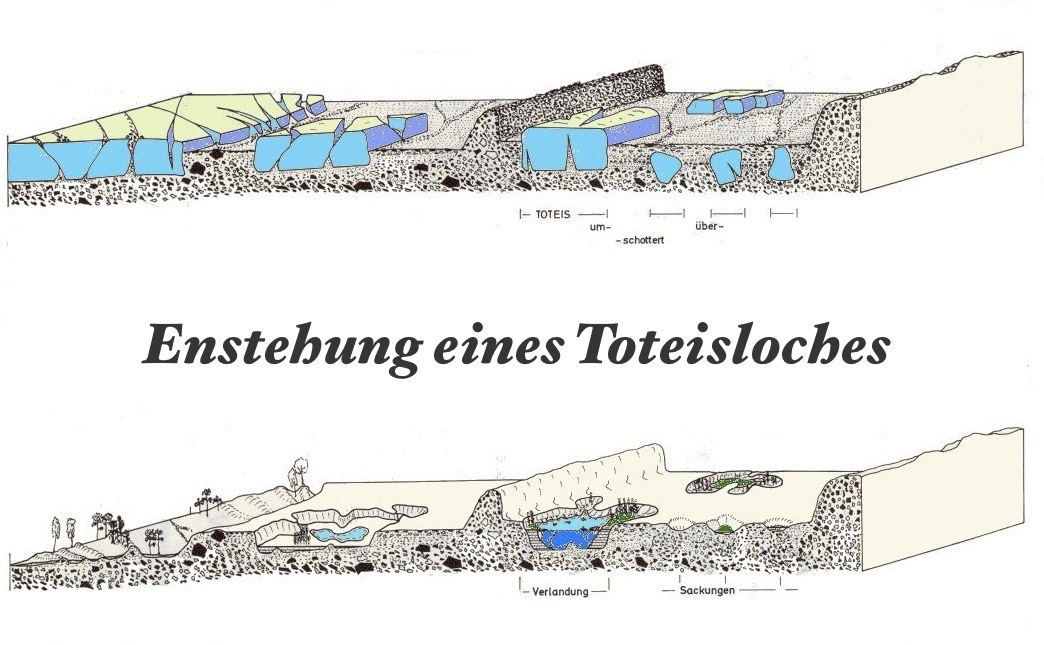 Beim Rückzug der Gletscher schwand das aktive Eis relativ schnell und so lösten sich Schollen ab, die also nicht mehr mit dem aktiven Gletscher verbunden waren und sich infolgedessen auch nicht mehr bewegten. Diese Schollen nennt man Toteis.