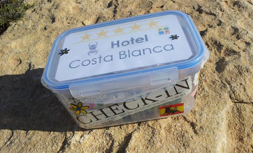 Das TB Hotel Costa Blanca ist eine mittelgroße Plastikbox, geschützt durch eine schwarze Tüte (bitte wieder gut einpacken!). Darin befindet sich ein "Guestbook" und ein Kugelschreiber. Loggen darf natürlich jeder, der diesen Cache besucht, einchecken dürfen ausschliesslich TBs, Coins und Geokrets.