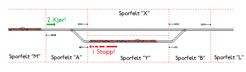 Prinsippet for signalanlegget på en tospors stasjon som Helldalsmo, med kryssing av to tog. Første tog kjører inn til siden og stopper foran utkjørsignal. Etter en tid får det andre toget grønt lys for å kjøre inn på det ledige sporet på stasjonen. Merk hvordan sporfeltinndelingen gir togene sikkerhetssoner - for eksempel kan du ikke ha tog stående i sporfelt "A" eller "B" når det andre toget skal kjøre inn; "A" fordi det inngår i veien toget skal kjøre, og "B" som en sikkerhet i tilfelle toget ikke skulle klare å stoppe ved signalet sitt inne på stasjonen.
