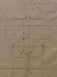 Das Bild links zeigt eine technische Zeichnung von 1905 wie der Hochbehälter aufgebaut ist.