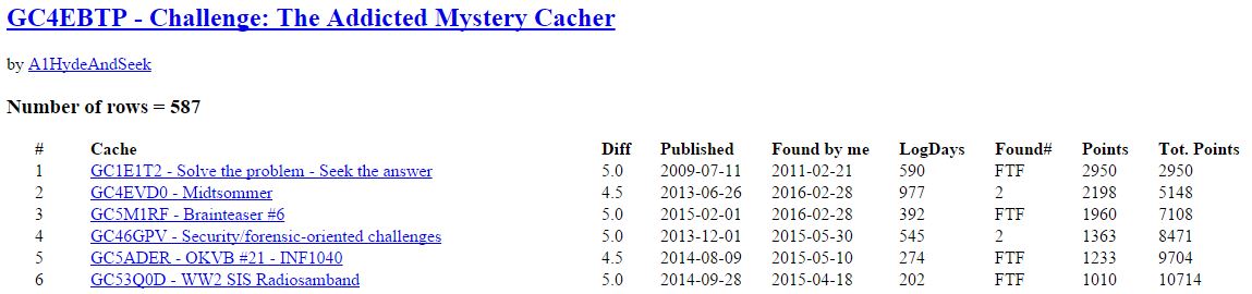 A1HydeAndSeek: All good thing must come to an end. Thanks to all the addicted cachers especially those addicted enough to try and climb the leader board. There is one person in Norway that had enough points to beat me and Xeiron but he hasn't logged the cache. If anyone logs after the fact please take the container with you else I'll arrange for it to be collected later [;)]