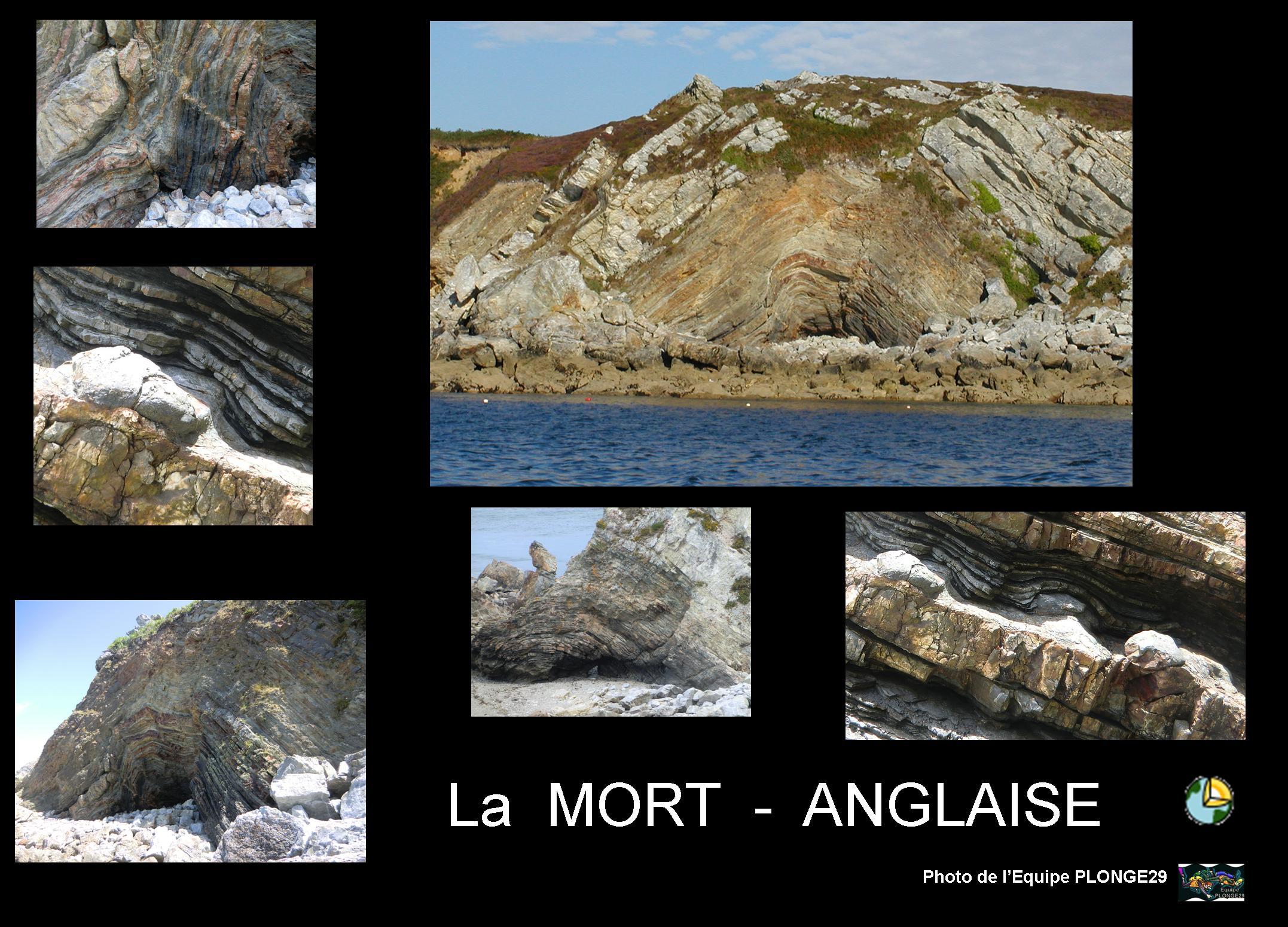 Mort-Anglaise's anticline is a right fold whose axis has a slight extension to the east. The heart of the anticline is occupied with a small alternating layers of sandstone and dark shale belonging to the middle period of the Armorican sandstone (shale and sandstone Gador, while flanks are formed by thick bench of white quartzite Armorican sandstone higher.