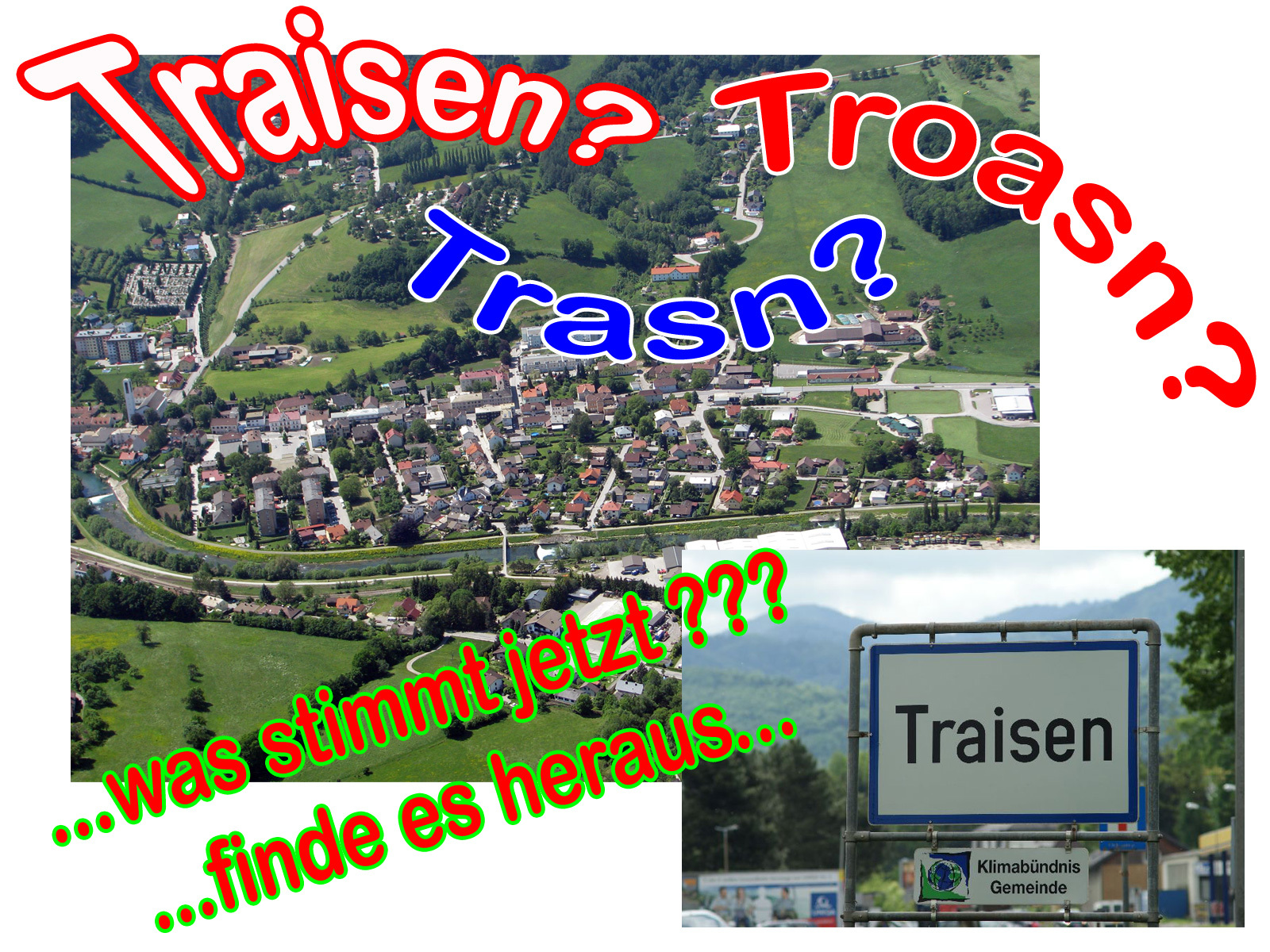Die Eingeborenen in Traisen artikulieren manchmal sehr unterschiedlich, wenn es um ihren Heimatort geht. So finden sich einige verschiedene Ausdrucksweisen für die Marktgemeinde. Welche sind offizielle amtssprachliche Ausdrücke?