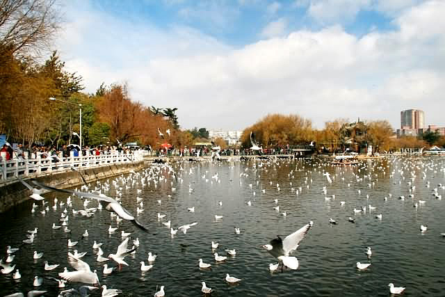 During the winter months, black-headed gulls from Siberia migrate to Green Lake and entertain the crowds of visitors as they circle around and snap up bread, usefully provided by a herd of local vendors, thrown up into the air by tourists. There are performances of pieces from Chinese operas and of folk music within and around the park.