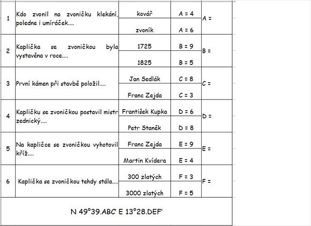 Otázky pro vyluštění: 1)Kdo zvonil na zvon? (Kovář A=4/ Zvoník A=6) 2)Kaplička byla vystavěna v roce? (1725 B=9/ 1825 B=5) 3) První kámen položil? (Jan Sedlák C=8/ Franc Zejda C=3) 4)Kapličku postavil? (František Kupka D=6/ Petr Staněk D=8) 5)Kříž vyhotovil? (Franc Zejda E=9/ Martin Kvídera E=4) 6)Kaplička stála? (300 zlatých F=3/ 3000 zlatých F=5). Vzorec pro výpočet : N 49°39.ABC′ E 13°28.DEF .
