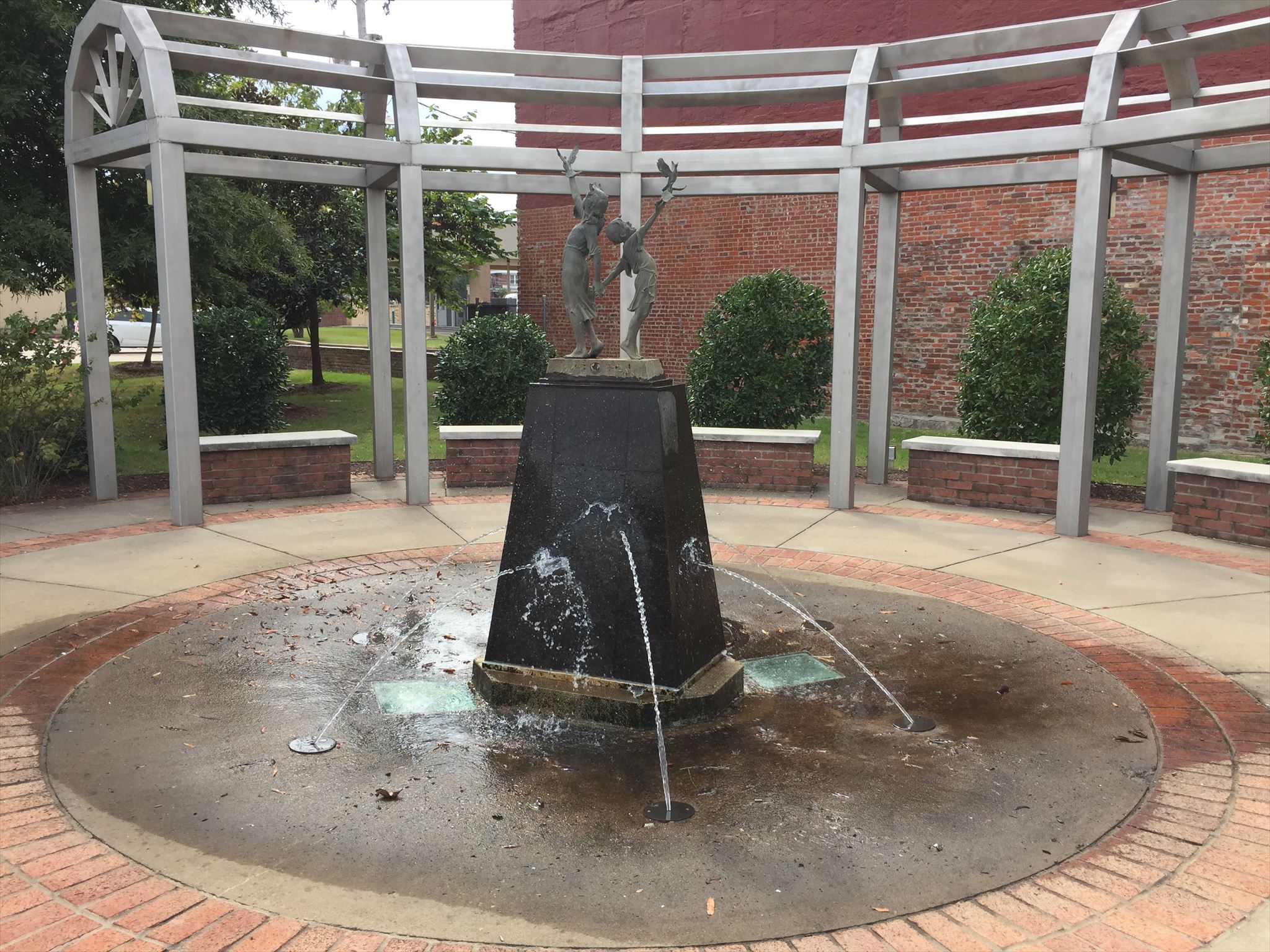 Six of the ten passengers who perished were from Russellville and the surrounding area, all members of the same tour group that had spent two weeks in the British Isles. This park was dedicated two years later, on June 1, 2001, in memory of those six residents. Their names may be found on the plaque on the wall near the plaza's main entrance. The park features six benches covered by a curved arbor and flanked by evergreen trees. The benches face a bronze sculpture of a young boy and girl reaching skyward with doves. Six fountains at the base of the sculpture spray water at varying angles to represent the personalities of the victims.