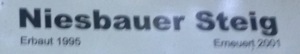 Beim Niesbauer Steig angekommen siehst du ein weißes Schild mit dem Namen des Steiges.