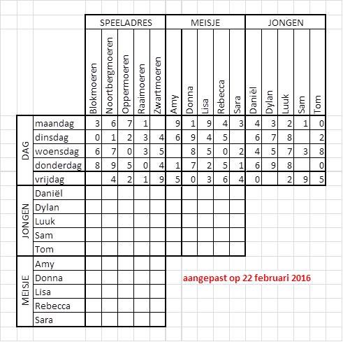 De Moerenbuurt is een van de vele wijken die de Haagse Beemden in het Noord-Westen van Breda rijk is. In deze buurt bevinden zich twee scholen: NBS De Hoogakker aan de Blokmoeren en KBS De Werft aan de Raaimoeren. Vaak spreken de kinderen van deze scholen af met klasgenootjes die ook in de Moerenbuurt wonen. Dit bracht ons op het idee van onderstaande logische puzzel. Je moet hierbij uitzoeken welke jongen met welk meisje heeft afgesproken, op welke dag en op welk speeladres. Lees de aanwijzingen goed, combineer ze en vind zo de juiste coördinaat van de cache.