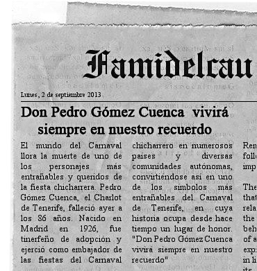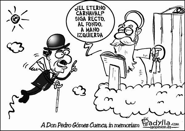 Recuerdos: Ramón Guimerá, historiador del Carnaval de Santa Cruz de Tenerife, reconocía el papel que durante tantos años representó Pedro Gómez. "Estamos hablando del personaje del Carnaval chicharrero por antonomasia; el personaje genuino, principal y pionero de la época moderna de nuestros carnavales, desde que se celebraban en la clandestinidad hasta cuando fueron denominadas como Fiestas de Invierno y posteriormente, en el Carnaval ya reconocido internacionalmente", afirma Guimerá. El personaje que interpretaba Pedro Gómez "siempre fue el más esperado y aplaudido", señala este experto quien añade que "siempre lo catalogué como una persona que con gran maestría supo captar la esencia del personaje que interpretaba". Asevera que "no era fácil mantener el tipo durante tanto tiempo, a lo largo de la Cabalgata o del Coso, y arrancando siempre aplausos y sonrisas de chicos y grandes. Nunca se le vio descansar de su personaje durante todas aquellas horas en las que estaba en la calle. Era un verdadero actor que interactuaba con el público muy bien arrancando sonrisas a niños y mayores". Tal fue la figura de Pedro Gómez Cuenca que "hoy por hoy no debe haber nadie en Tenerife que pueda recordar un Carnaval en el que no estuviera nuestro Charlot", afirma el historiador. Guimerá también quiso trasladar a toda su familia sus más sentidas condolencias por el fallecimiento de Pedro Gómez a quien definió también como "una bellísima persona". Por su parte, Santiago Díaz, que encarna a Harpo Marx en las fiestas de Santa Cruz, lo consideraba como un padre y asegura que si no hubiera sido por él, nunca se habría puesto en la piel del segundo de los hermanos más cómicos de la historia del cine. "Siempre lo llevaré en el corazón y estará al lado de mucha gente que ama el Carnaval".