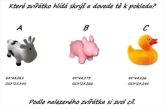 Tato multi-cache Vás zavede ke kapličce na návsi v Božkově. Zde je možné zaparkovat i geovozidlo. Keš není přímo na návsi, nenachází se ani v kapličce, je trochu stranou, abyste mohli v klidu hledat a posléze i logovat. POZOR hrozí možné ušpinění, je lepší zvolit vhodný přístup!! Jedná se o krabičku lock & lock menší velikosti. Vyndání může být prozatím obtížnější. Při samotném odlovu Vám bude vše jasné, hned jak přijdete na místo, proto prosím ŽÁDNÉ násilí. Měňte prosím fér a chovejte se nenápadně a ohleduplně. Děkuji. Pro odlov potřebujete najít na výchozích souřadnicích úkryt zvířátka. Podle toho, které je to zvířátko se můžete vydat k finálovým souřadnicím podle následujícího obrázku.