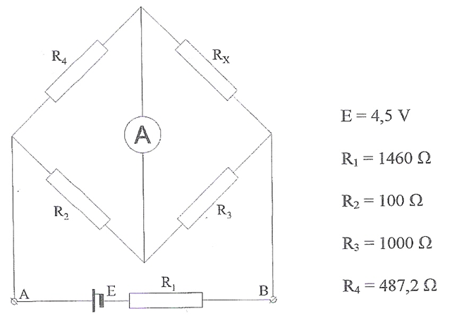 Hoe groot is de weerstand Rx in onderstaande schakeling als de ampèremeter nul aanduidt. Bepaal ook de stroom door R1. Geef de uitkomsten in resp. W en mA, deze laatste afgerond op 3 cijfers na de komma.