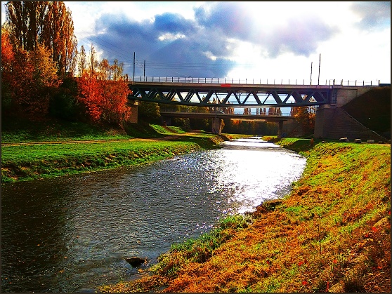 Najednou na železničním mostě vysoko nad řekou zarachotil projíždějící vlak. "Tenhle most je tu už od roku 1862", vyprávěla dál moje přítelkyně, "a byl čtvrtým největším České západní dráhy. Kolik lidí tu nade mnou přejelo, cestovali za svými známými, za rodinou, za prací, děti mi mávaly a já jim posílala trochu odrazů slunce do oken, abych je potěšila. Pak ale začátkem prusko-rakouské války byla železná konstrukce snesena, protože byl most strategickým vojenským bodem a Prusové ho obnovili až po několika letech. Roku 1877 museli vyměnit původní nekvalitní mostovku a během montáže došlo k nehodě, kdy dva dělníci zemřeli a několik dalších bylo zraněno. Bylo mi jich líto, sledovala jsem to jejich urputné úsilí vybudovat novou dráhu pro ty spousty generací, co přijdou po nich, a obdivovala jsem je, jak dřou od východu slunce až do tmy. Ta trať byla od počátku jednokolejná, druhá kolej se přistavovala až kolem roku 1926, což znamenalo i rozšíření mostu a úpravu pilířů. Ty krajní tím ztratily svá typická mohutná cimbuří, ke středovému oválnému přistavěli nový obdélníkový a byla opět nahrazena mostovka novou s odlišným systémem konstrukce. Poslední velká oprava, kterou si pamatuji, proběhla v 80. letech minulého století. Tenhle most je můj kamarád, protože ho postavili tak dobře, že si kolem něj můžu vesele dovádět, a on se na mě jen shovívavě usmívá ze své výšky. Říkají o mně, že tu čas od času vystupuji až několik metrů nad normální hladinu a jeho se to ani nedotkne. Chová se ke mně jako urozený elegán ke ztřeštěné holce. Mám ho ráda…"