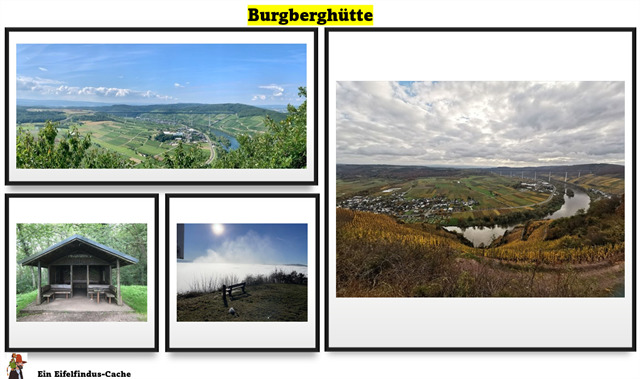 An diesem schönen Ort befindet sich auf einem freien Plateau mit kleiner Wiese eine gut gepflegte, für jeden Wanderer offene Grillhütte -die Burgberghütte mit Tischen und Bänken zum Ruhen und Rasten. Von hier aus hat man einen wunderbaren Blick hinab ins Moseltal oder in die Wittlicher Senke oder bei guten Fernsichten in den Hunsrück.