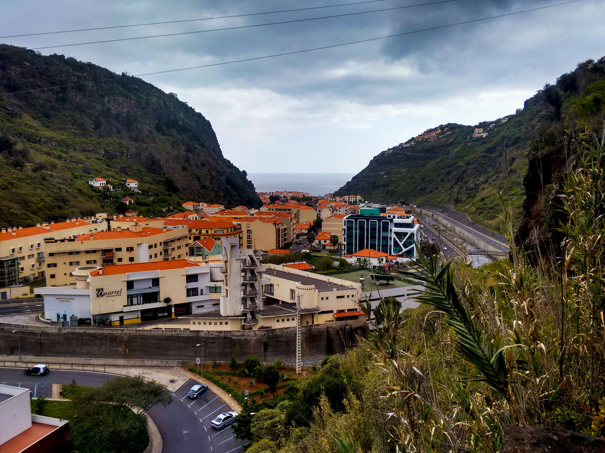 A partir do GZ, olhando para sul, vêmos a bonita vila da Ribeira Brava, e, olhando para este, vêmos o Centro de Saúde da Ribeira Brava.