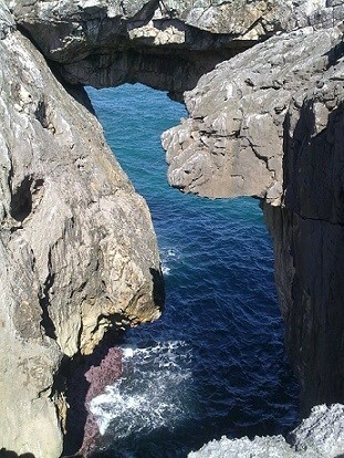 Substrate materials present in the area where Cobijeru Beach opens are Carboniferous limestones. They present a marine karst modeling with an abundance of sinkholes, sinkholes, chasms and caves. Cobijeru Beach is a sinkhole really, the bottom of which communicates with the sea through a small cave and some cracks and bedding planes enlarged by erosion. The distribution of sand and pebbles, in a semicircle, informs us the refraction that the waves suffer when they get to reach to the beach. At the north, Cobijeru Beach is separated from the waterfront by a rocky projection where erosion has left a stone arch, known as the Salto del Caballo (Leaping Horse), and opened a blowhole with oblique rise towards the beach. In the southern part of the beach drains a small stream whose channel is carved in the limestone. Normally the flow is very small, but at some seasons should increase considerably, and is able to break the sandbar, shaped by the waves in the back of the beach and build pebbles of low relief on the sand, creating an atmosphere of small estuary and halophilic features. In fact, the sands of Cobijeru Beach come largely from quartzites of the High Sierras, swept away for the stream.